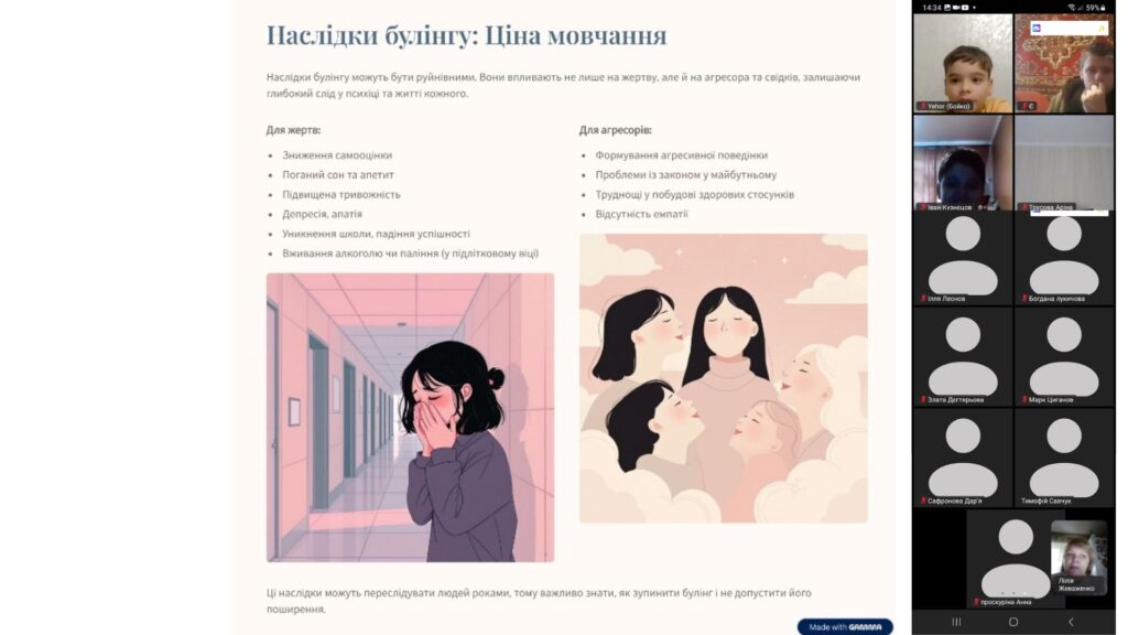 Діти дізналися про різні форми булінгу – від фізичного до психологічного, та обговорили, як правильно діяти, коли стаєш свідком чи жертвою такого явища. Разом створили пам’ятку «Стоп булінг», яка допоможе кожному не залишатися осторонь і підтримувати однокласників.