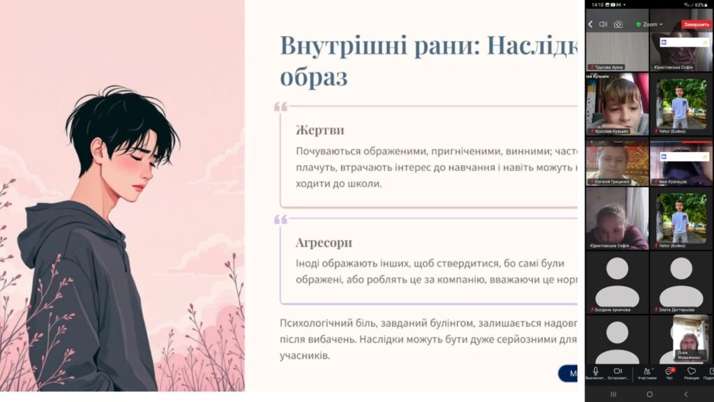 Під час заняття школярі переглянули соціальні ролики, обговорили реальні приклади та навіть провели незвичний експеримент із грушами, що наочно показав, як слова й дії можуть залишати «невидимі синці» у душі людини.