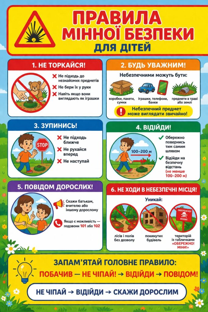 Сьогодні, як ніколи, знання правил мінної безпеки може врятувати життя. Небезпечні предмети можуть траплятися у найнесподіваніших місцях — на вулиці, в полі чи навіть біля дому. Тому кожна дитина має знати, як діяти правильно: не підходити, не торкатися та одразу повідомляти дорослих.