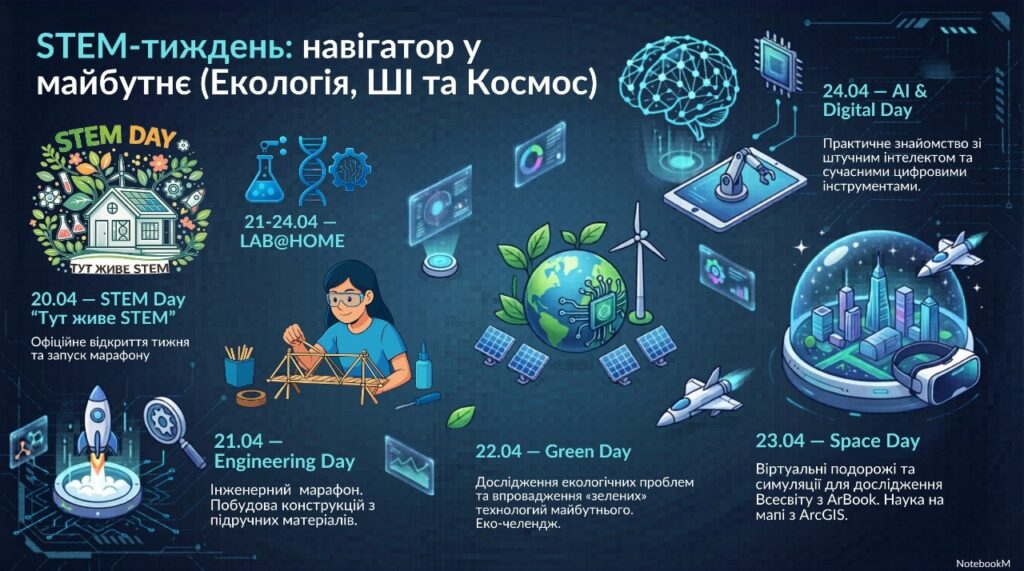 Друзі, готуйтеся до повного занурення у світ науки, технологій та інженерії! Запрошуємо вас на неймовірний марафон, де ми будемо досліджувати Екологію, ШІ та Космос.