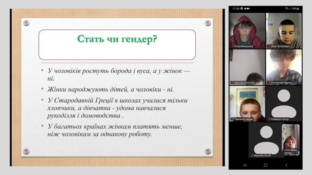 Під час зустрічі школярі ознайомилися з поняттями гендер, гендерна рівність, гендерні стереотипи та гендерна дискримінація. У формі інтерактивних вправ, обговорень та роботи в групах учні вчилися аналізувати факти, розпізнавати стереотипні уявлення та робити власні висновки.