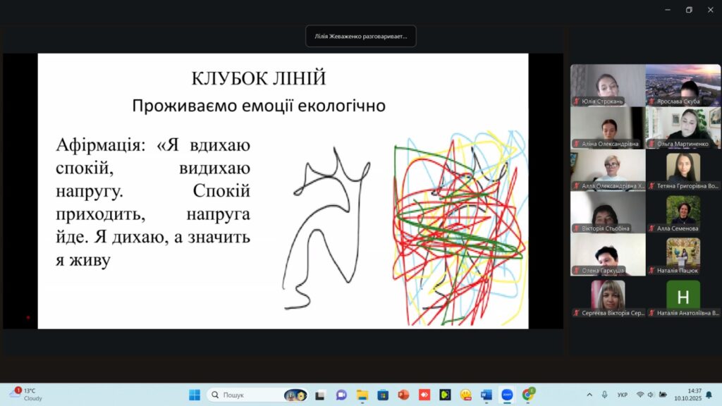 Протягом зустрічі вчителі виконували практичні вправи — тілесну релаксацію та арт-техніки «Клубок ліній» і «Чарівне зілля». Ці методи допомогли учителям відчути себе спокійніше, зрозуміти власний емоційний стан і знайти ресурси для відновлення.