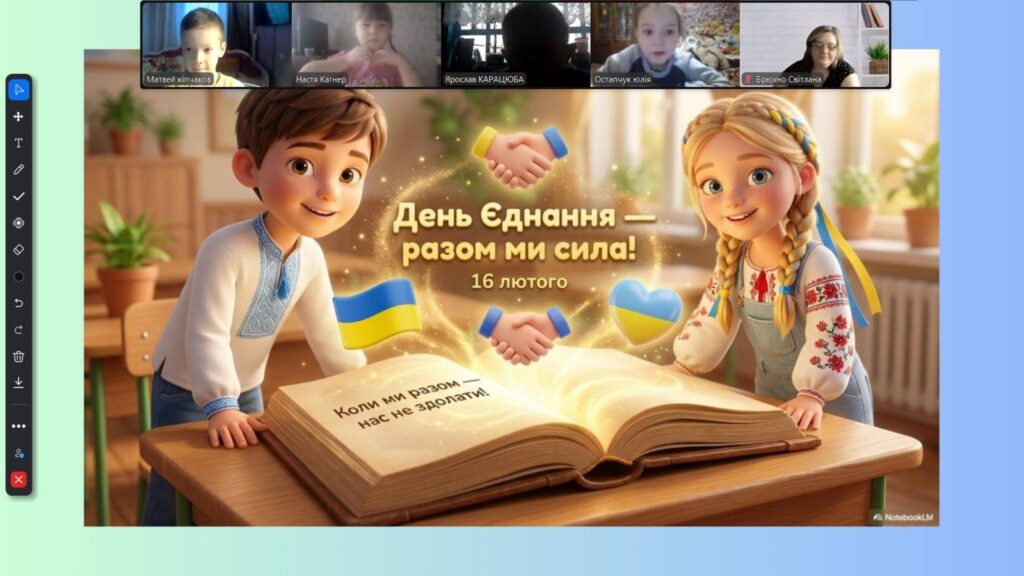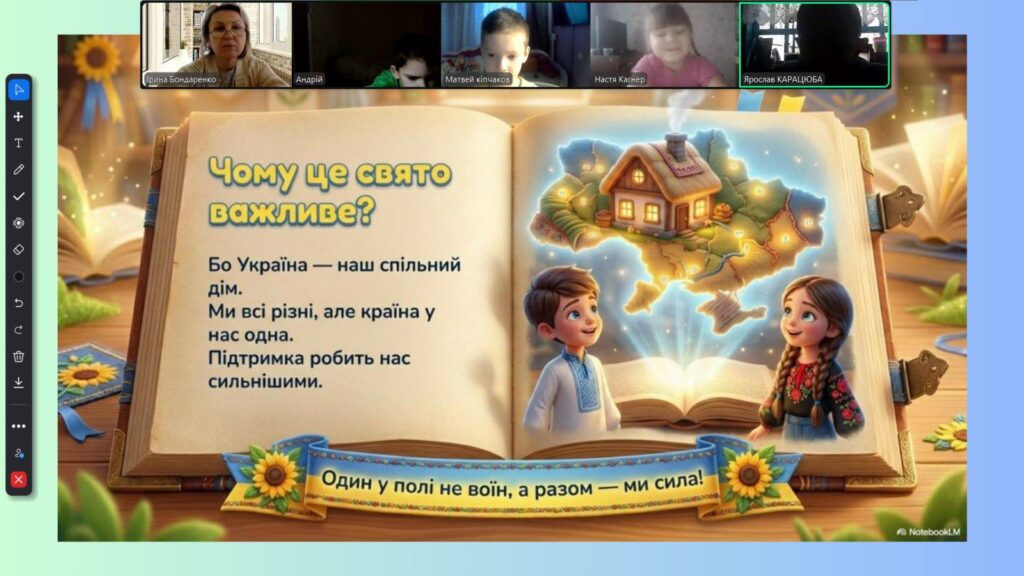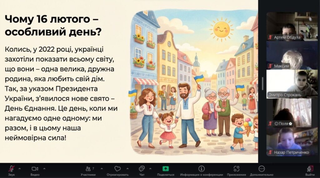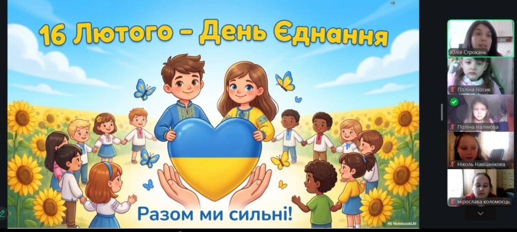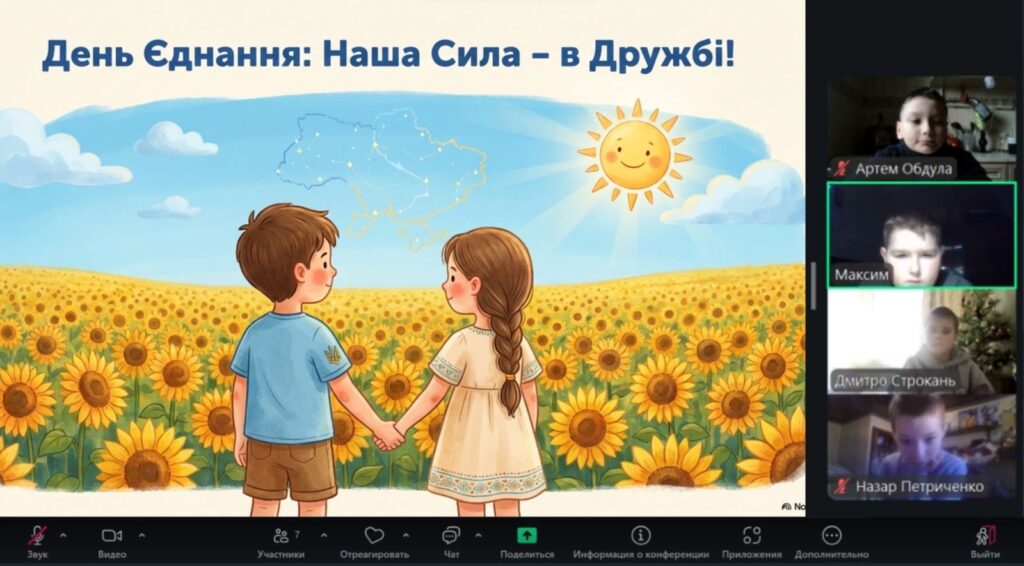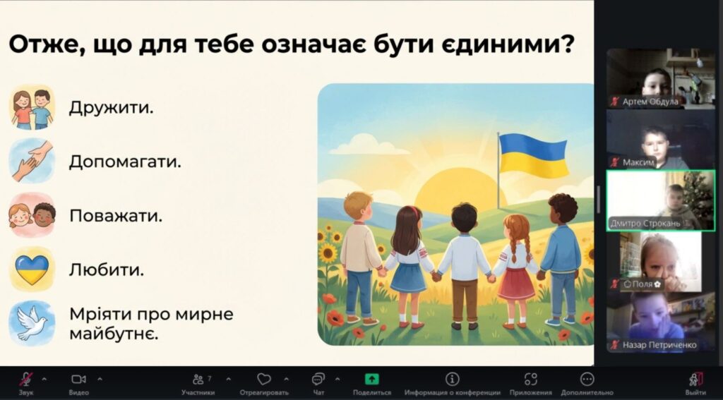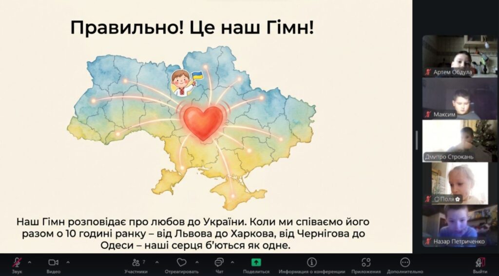 Особливим моментом стало створення онлайн «ланцюжка єдності»: маленькі серця билися в унісон під час виконання Гімну України. Діти підняли долоньки та склали з них символічне серце — як знак любові до України та віри в нашу спільну силу.