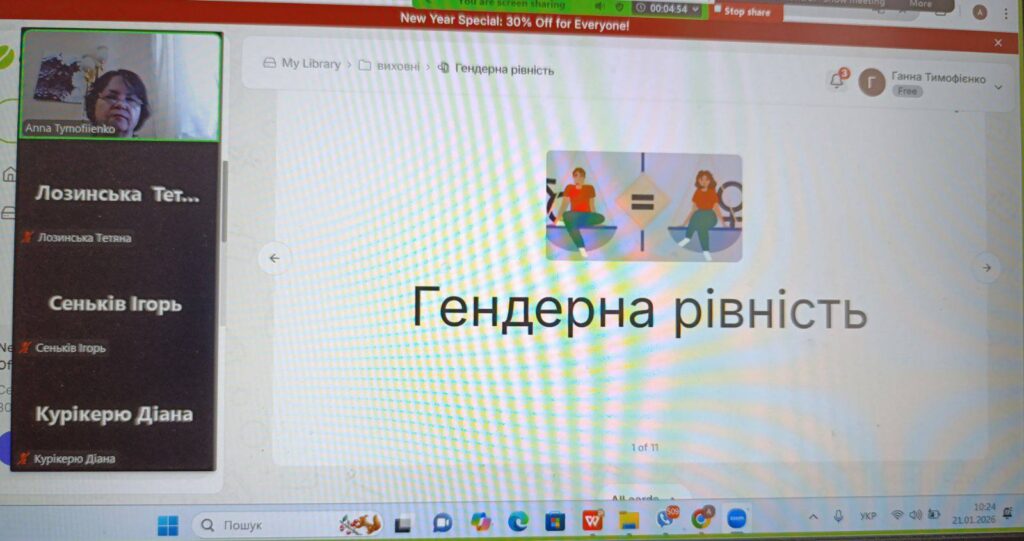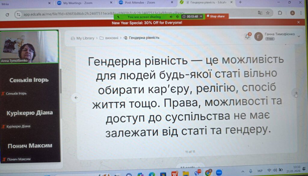 Сьогодні у 11-Б класі (класний керівник Тимофієнко Г.Г.) відбулась важлива година спілкування на тему „Гендерна рівність“. Під час зустрічі обговорили значення рівних прав та можливостей для кожного, розвіяли поширені стереотипи та дізналися, як повага один до одного допомагає будувати гармонійне суспільство.